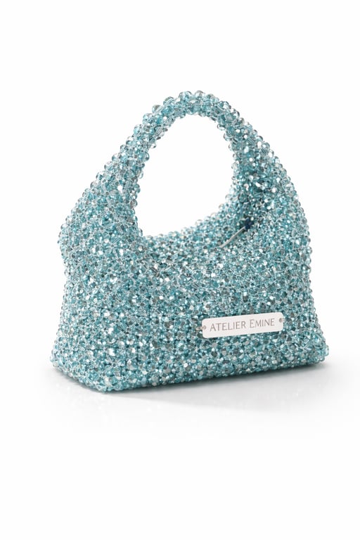 Kristal boncuk yüzey, akışkan ve doğal eğimli gövde formu üzerinde yüksek yoğunluklu örgü tekniğiyle oluşturulmuş; çanta, sert çerçeve veya metal iskelet kullanılmadan formunu koruyacak şekilde yapılandırılmıştır. Yüzey bütünlüğü ve taşıma dengesi milimetrik toleranslarla sağlanmıştır.