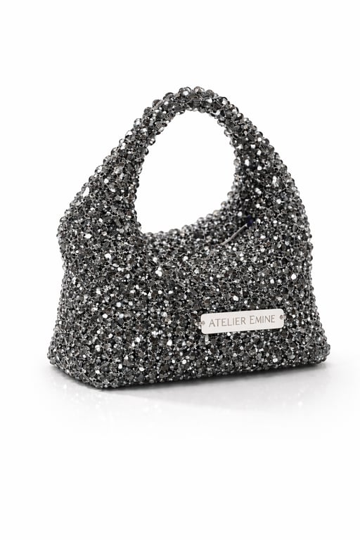 Atelier Emine’in Crystal Gelato Couture koleksiyonuna ait Budino Grafite, 8 mm optik sınıfı kristal boncukların yüksek dayanımlı misina ile tek tek örülmesiyle tamamen el işçiliğiyle üretilmiş, yumuşak geçişli heykelsi formda premium mini çanta modelidir.