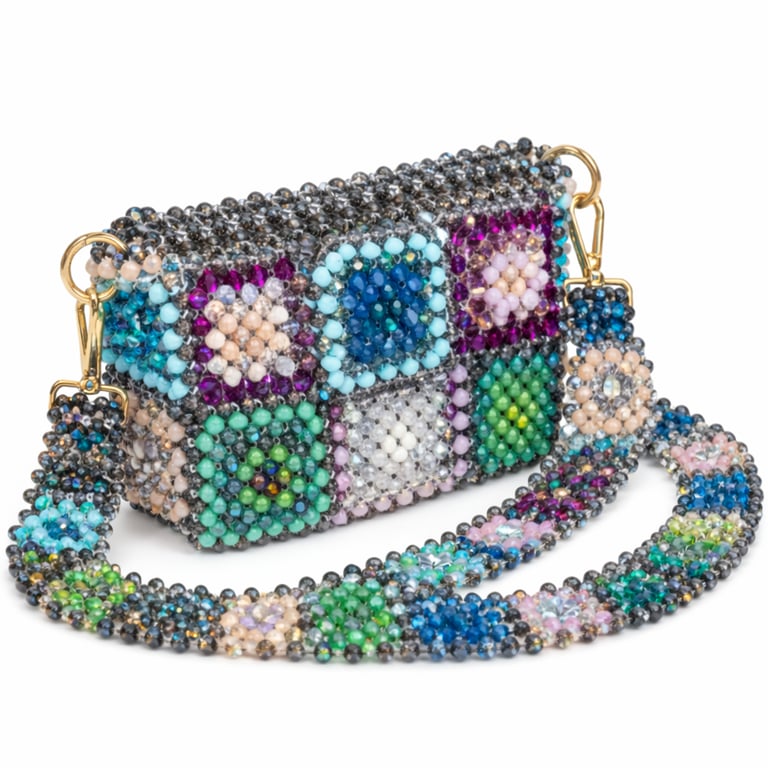 Model, geometrik modüllerden oluşan kare bazlı kristal panellerin bir araya getirilmesiyle yapılandırılmıştır. Her panel, merkezde yoğunlaştırılmış kristal kompozisyon ve çevresel mikro boncuk çerçeve tekniği ile üç katmanlı derinlik etkisi oluşturacak şekilde tasarlanmıştır. Bu yapı, yüzeyde ışık kırılımını homojen değil, kontrollü ve segmentli bir şekilde dağıtarak çantaya mimari bir karakter kazandırır.