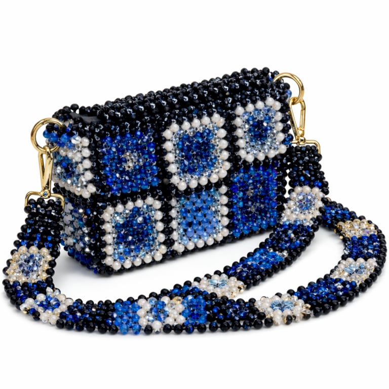 Model, geometrik modüllerden oluşan kare bazlı kristal panellerin bir araya getirilmesiyle yapılandırılmıştır. Her panel, merkezde yoğunlaştırılmış kristal kompozisyon ve çevresel mikro boncuk çerçeve tekniği ile üç katmanlı derinlik etkisi oluşturacak şekilde tasarlanmıştır. Bu yapı, yüzeyde ışık kırılımını homojen değil, kontrollü ve segmentli bir şekilde dağıtarak çantaya mimari bir karakter kazandırır.