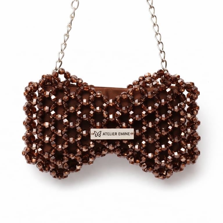 Atelier Emine’in Crystal Gelato Couture serisine ait Fresco Espresso, 8 mm optik sınıfı kristal boncukların yüksek dayanımlı misina ile örülmesiyle tamamen el işçiliğiyle üretilmiş, fiyonk formunda heykelsi bir mini çanta modelidir.