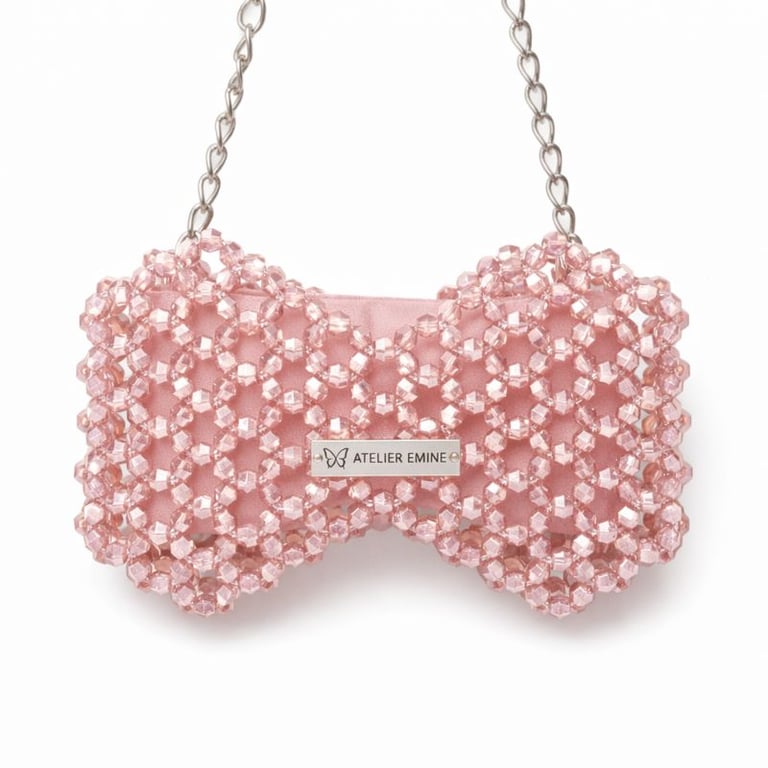 Kristal boncuklar, yüzeyde güçlü bir doku derinliği ve net ışık kırılımı oluşturacak şekilde yoğun ve modüler bir örgü sistemiyle tek tek işlenmiştir. Gövde, iki simetrik hacmin merkezde birleştiği fiyonk siluetiyle yapılandırılarak güçlü bir görsel kimlik elde edilmiştir.