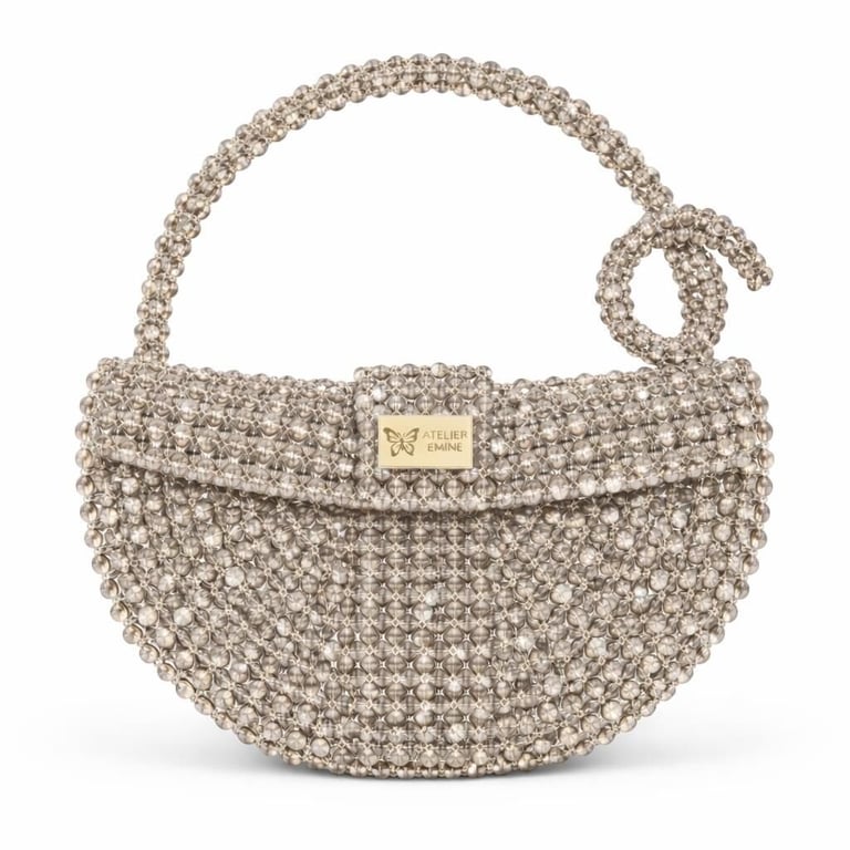 Atelier Emine’in Crystal Gelato Couture serisine ait Melo Cremino, 8 mm optik sınıfı kristal boncukların yüksek dayanımlı misina ile örülmesiyle tamamen el işçiliğiyle üretilmiş, yarım ay formunda premium mini çanta modelidir.