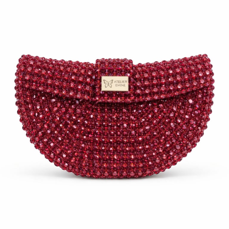 Atelier Emine’in Crystal Gelato Couture serisine ait Melo Fragola, 8 mm optik sınıfı kristal boncukların yüksek dayanımlı misina ile örülmesiyle tamamen el işçiliğiyle üretilmiş, yarım ay formunda premium mini çanta modelidir.