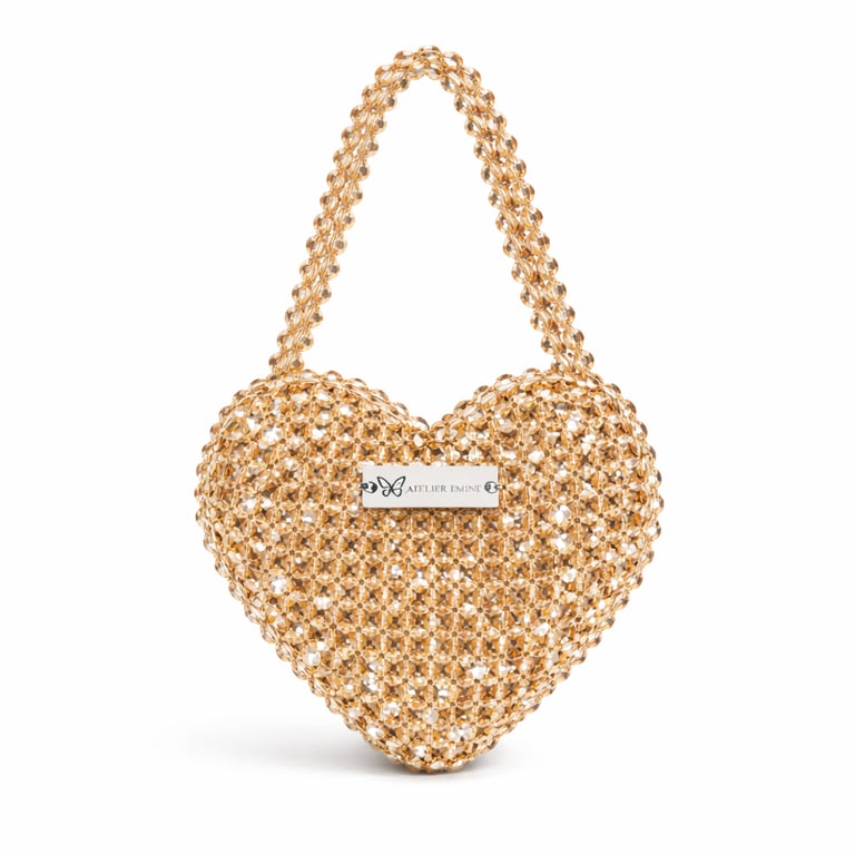 Kristal boncuklar yüksek dayanımlı misina ile tek tek örülerek üç boyutlu kalp formu hassas toleranslarla oluşturulmuş, yüzey bütünlüğü ve yapısal denge korunmuştur.