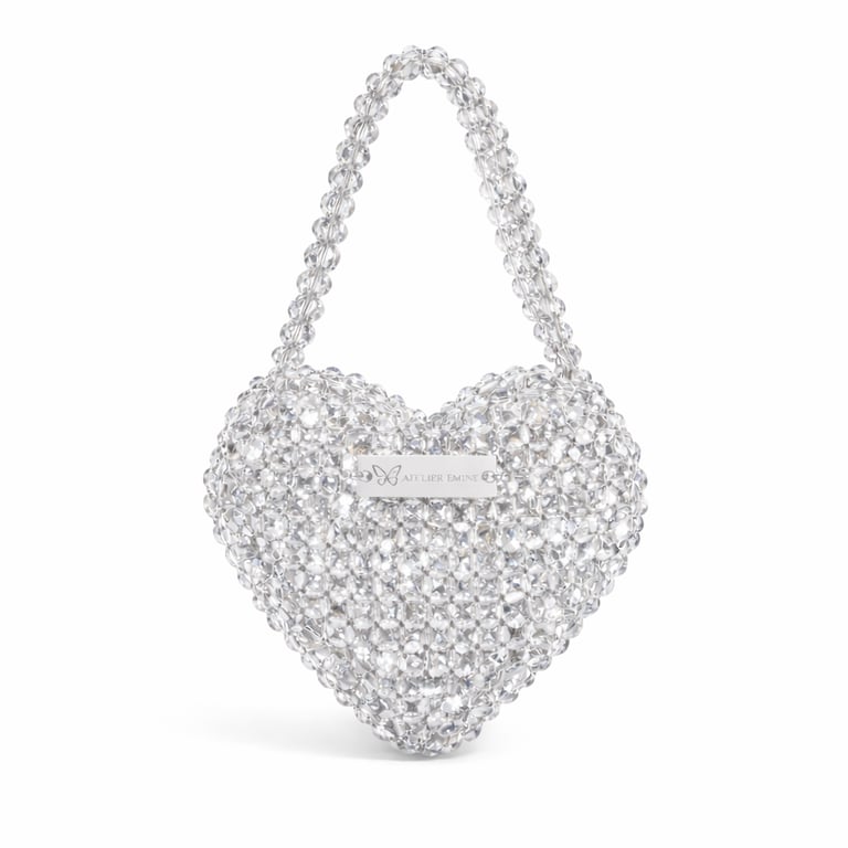Kristal boncuklar yüksek dayanımlı misina ile tek tek örülerek üç boyutlu kalp formu hassas toleranslarla oluşturulmuş, yüzey bütünlüğü ve yapısal denge korunmuştur.