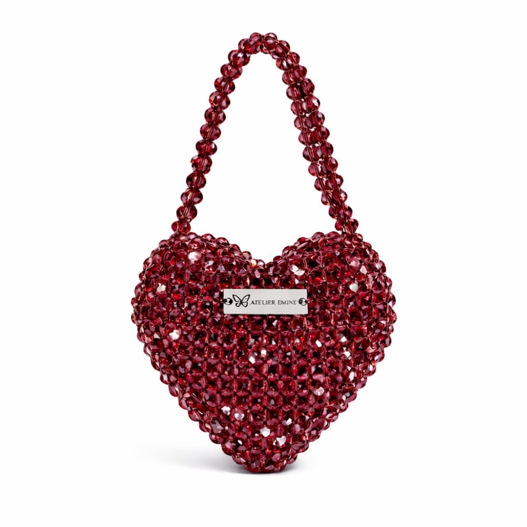 Kristal boncuklar yüksek dayanımlı misina ile tek tek örülerek üç boyutlu kalp formu hassas toleranslarla oluşturulmuş, yüzey bütünlüğü ve yapısal denge korunmuştur.