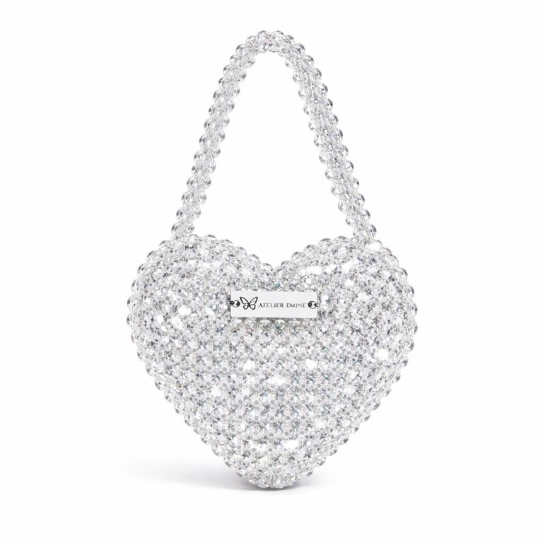 Atelier Emine’in Crystal Gelato Couture serisine ait Mielo Pure, 8 mm optik sınıfı kristal boncuklar ve üst taşıma kulpu kullanılarak tamamen el işçiliğiyle üretilmiş heykelsi formda premium mini çanta modelidir.