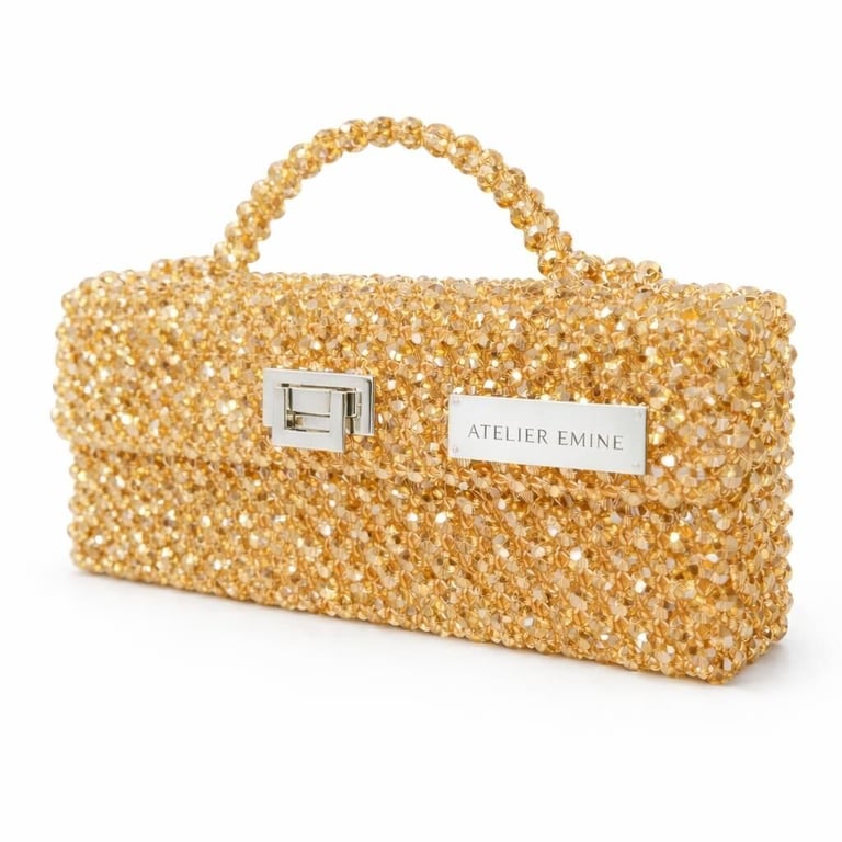 Atelier Emine’in Crystal Gelato Couture serisine ait Panna Limone, 8 mm optik sınıfı kristal boncuklar, üst taşıma kulpu, metal kilit mekanizması ve saten astar kullanılarak tamamen el işçiliğiyle üretilmiş premium top-handle clutch modelidir.