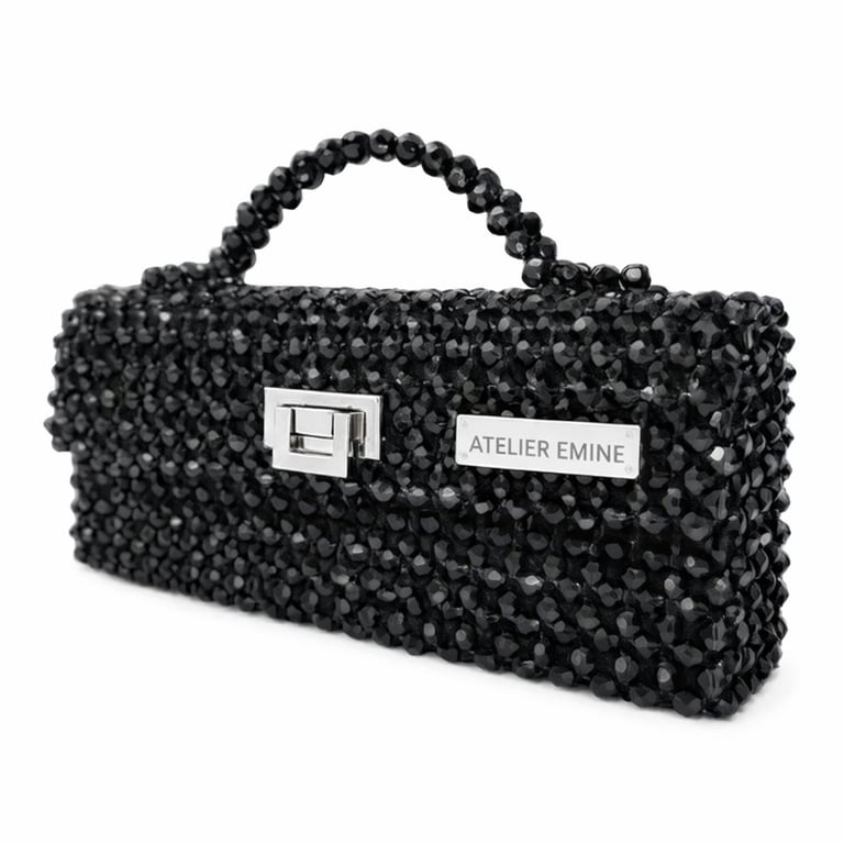 Atelier Emine’in Crystal Gelato Couture serisine ait Panna Midnight, 8 mm optik sınıfı kristal boncuklar, üst taşıma kulpu, metal kilit mekanizması ve saten astar kullanılarak tamamen el işçiliğiyle üretilmiş premium top-handle clutch modelidir.