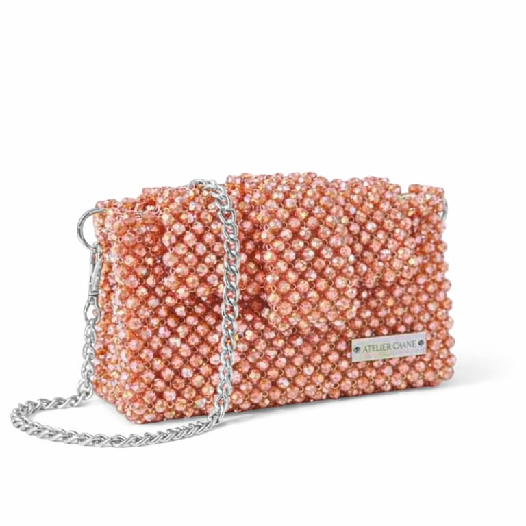 Atelier Emine’in Crystal Gelato Couture serisine ait Panna Petal, 8 mm optik sınıfı kristal boncuklar, metal omuz zinciri ve saten astar kullanılarak tamamen el işçiliğiyle üretilmiş premium clutch modelidir.