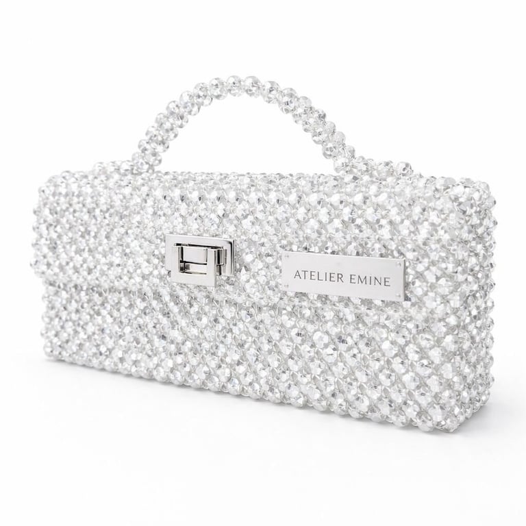 Atelier Emine’in Crystal Gelato Couture serisine ait Panna Silver, 8 mm optik sınıfı kristal boncuklar, üst taşıma kulpu, metal kilit mekanizması ve saten astar kullanılarak tamamen el işçiliğiyle üretilmiş premium top-handle clutch modelidir.