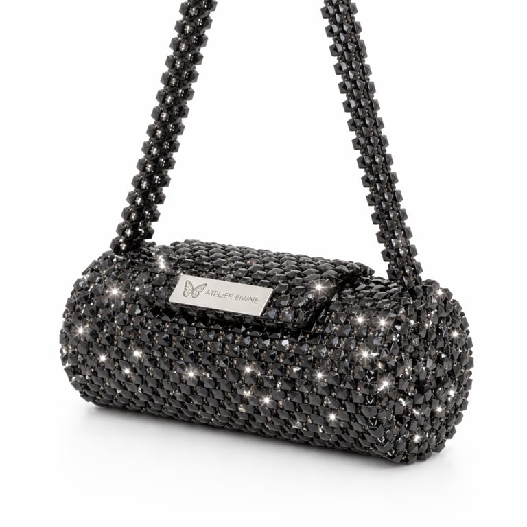 Kristal boncuklar tek tek örülerek homojen bir yüzey dokusu elde edilmiş; gövde, silindirik formda yapılandırılarak kendi kendini taşıyabilen dengeli bir strüktür oluşturulmuştur. Kristal örgü yoğunluğu, çantanın form bütünlüğünü ve estetik sürekliliğini destekler.