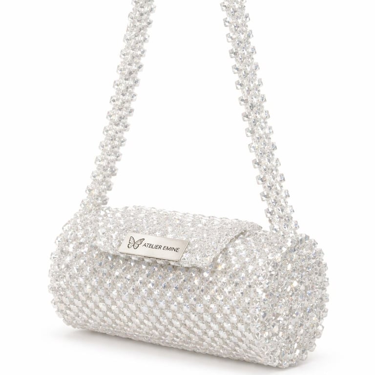 Atelier Emine’in Crystal Gelato Couture serisine ait Ricotta Snow, 8 mm optik sınıfı kristal boncukların yüksek dayanımlı misina ile örülmesiyle tamamen el işçiliğiyle üretilmiş, zamansız ve rafine bir mini çanta tasarımıdır.