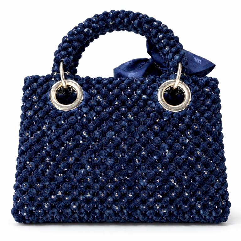 Velvet Noir Couture koleksiyonunun alt serisi olan Silva’ya ait Silva Denim, kadife kaplı mikro boncukların yüksek yoğunlukta misina ile örülmesiyle oluşturulan, kompakt ve mimari bir couture çanta modelidir. Yüzey, tamamen kadife boncuk örgüden oluşur; bu yapı, boncukların yumuşak dokusu ile formun sert geometrisi arasında bilinçli bir gerilim yaratır.