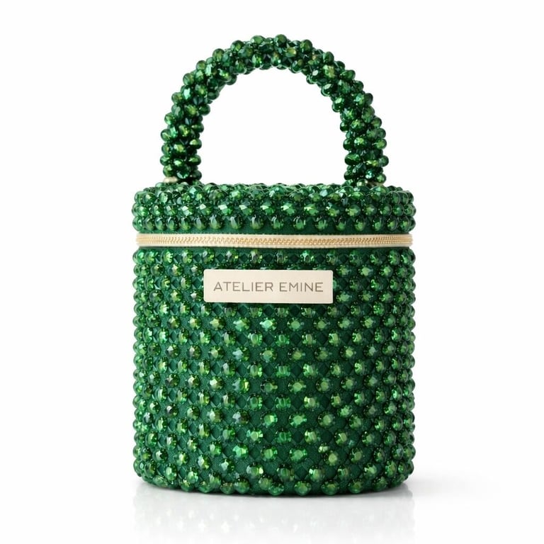 Atelier Emine’in Crystal Gelato Couture serisine ait Sorbetto Mint, 8 mm optik sınıfı kristal boncukların yüksek dayanımlı misina ile örülmesiyle tamamen el işçiliğiyle üretilmiş, mimari netlikte formu olan premium mini çanta modelidir.