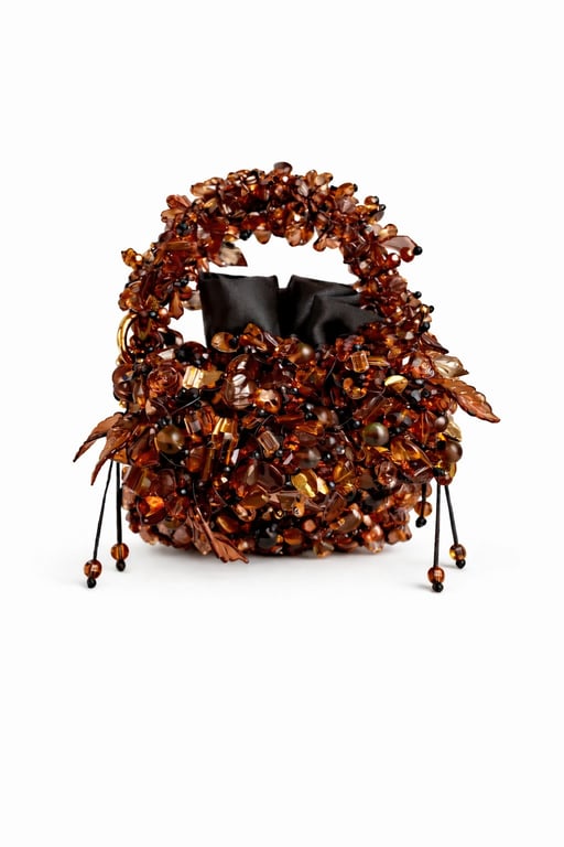 Atelier Emine’in Crystal Gelato Couture serisine ait Stracci Nutmeg, çok katmanlı kristal yüzey kurgusu ve heykelsi hobo formu ile tasarlanmış, tamamen el işçiliğiyle üretilmiş premium mini çanta modelidir.