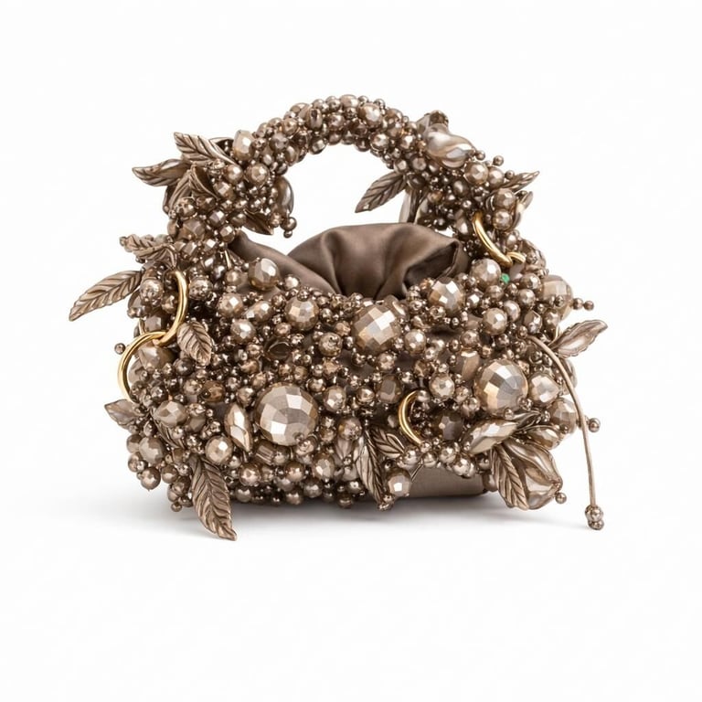 Gövde yapısı, farklı kesim ve hacimlerde kristal boncukların yüksek dayanımlı misina ile tek tek örülmesiyle oluşturulmuş; yüzey boyunca kontrollü düzensizlik prensibiyle ilerleyen üç boyutlu bir doku elde edilmiştir. Bu teknik, çantaya ışık altında canlı fakat doğal bir kırılma etkisi kazandırırken, yüzeyde monotonluğu kıran couture düzeyinde bir derinlik sunar.