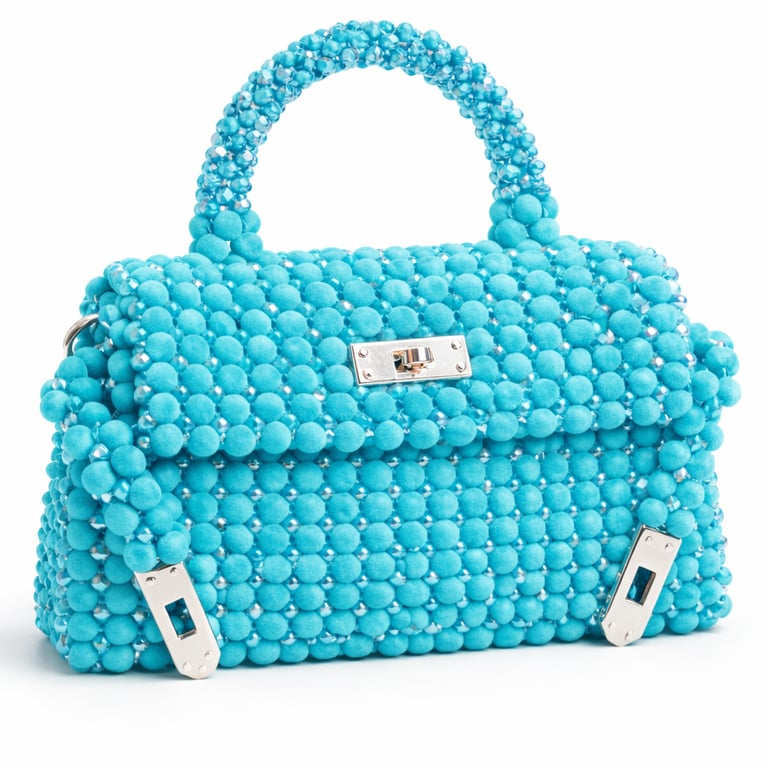 Gövde formu, kadife boncuk örgünün doğal akışını koruyacak şekilde dengelenmiş; aynı zamanda kristal boncukların ağırlığını taşıyabilmesi için içten yapısal destekle güçlendirilmiştir. Misina örgü tekniği sayesinde çanta yüzeyi dikişsiz, kesintisiz ve heykelsi bir bütünlük sunar.