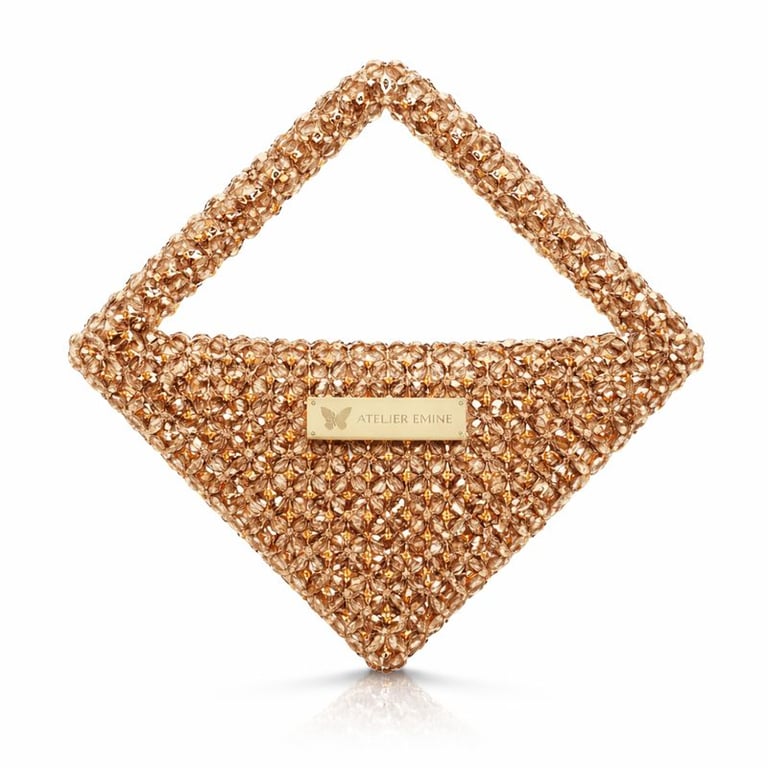 Atelier Emine’in Crystal Gelato Couture serisine ait bu tasarım; 8 mm optik sınıfı kristal boncuklar kullanılarak, tamamen el işçiliğiyle üretilmiş geometrik formlu premium mini çanta modelidir.