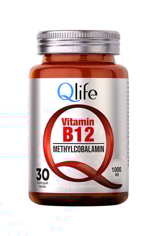 B12 vitamini suda çözünebilen, vücut için çok önemli fonksiyonları olan bir B vitamini türüdür.;Kobalamin olarak da bilinen B12 vitamini, vücudunuzun ihtiyaç duyduğu ancak üretemediği önemli bir vitamindir.;B12 eksikliği, B12 vitamini seviyesiçok azaldığında ortaya çıkan bir durumdur.;B12 vitaminin doğru miktarlarda alımı vücut için önemlidir.;Qlife Vitamin B12 formülü biotinve folik asitile güçlendirilmiştir.;“B12 vitamini sinir sisteminin normal işleyişine katkıda bulunur.;“B12 vitamini normal psikolojik fonksiyonlara katkıda bulunur.;“B12 vitamini yorgunluk ve bitkinliğin azalmasına katkıda bulunur.;“B12 vitaminin hücre bölünmesinde görevi vardır.;*Türk Gıda Kodeksi Beslenme ve Sağlık Beyanları Yönetmeliği (29960 mükerrer / 26.01.2017 tarihli resmî gazete);Kimyasal tatlandırıcı ve renklendirici içermez.;60 adet bitkisel tablet içermektedir.;Sertifikalar: Helal, GMP, Haccp, Iso 9001 ve Iso 22000 sertifikaları mevcuttur.;Nasıl Kullanılır? Qlife B12 Tablet için önerilen miktar, yetişkinler için günde 1 tablettir.;Tavsiye edilen günlük dozda kullanılmalı ve daha fazla alınmamalıdır.;Uyarılar: Çocukların ulaşamayacağı yerde saklayın.;Tavsiye edilen günlük porsiyonu aşmayın.;Hamilelik ve emzirme dönemi ile hastalık veya ilaç kullanılması durumlarında doktorunuza danışın.;İlaç değildir.;Takviye edici gıdadır.