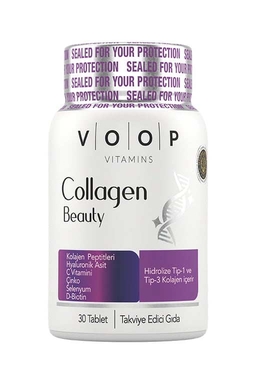 Collagen Beauty Tip 1 Ve Tip 3 | Hyaluronic Asit Q10 Biotin Çinko - 30 Tablet;Voop Kolajen Tablet, Tip 1 ve Tip 3 Kolajenlerini içeren avrupa;Standartlarına uygun %100 sığır kaynaklı Kolajendir.;Hyaluronik asit ve çinko ile zenginleştirilmiştir.;Işık geçirmeyen, sağlıklı ambalaj kullanılmıştır.;Gluten içermez.;Kolajen Cilt, Saç ve Tırnaklarınızın Kolajen ihtiyacını karşılamaya yardımcı olur.;Kolajen cildin canlı ve sıkı gözükmesini desteklerken, ciltteki kırışıklığın azaltılmasına yardımcı olur.;Çinko normal DNA sentezine katkıda bulunur.;C vitamini bağışıklık sisteminin normal fonksiyonuna katkıda bulunur.;Kullanım Talimatı: Tavsiye edilen günlük alım miktarı 11 yaş+ ve üzeri yetişkinler için 1 tablettir.;Uyarılar: Çocukların ulaşamayacağı yerde saklayın.; Tavsiye edilen günlük porsiyonu aşmayın.; Hamilelik ve emzirme dönemi ile hastalık veya ilaç kullanılması durumlarında doktorunuza danışın.;Takviye edici gıdalar normal beslenmenin yerine geçemez.;İlaç değildir.; Hastalıkların önlenmesi veya tedavi edilmesi amacıyla kullanılmaz.;Cildinizin, Tırnaklarınızın ve Saçlarınızın Kolajen İhtiyacını Hemen Karşılayın!
