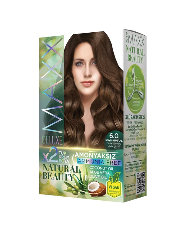 · Amonyaksız özel formülüyle kokusuz boyama konforu. · Zengin yağ bakım içeriğiyle güçlendirici etki. · Yoğun kalıcı renk ve parlaklık. · Dipten uca renk bütünlüğü ve mükemmel beyaz kapama. · 22 renk seçeneği. · Paraben ve slikon içermez. · Maxx Deluxe Natural Beauty, formülündeki renk sabitleyici ajanlar sayesinde rengin saçta daha uzun süre kalmasını sağlar. · Aloe vera, saç derisini ölü hücrelerden arındırır, hassas saç derisini yatıştırır. · Aloe vera içeriğindeki A, B ve C vitaminleri ile saçı besler ve sağlıklı uzamasına yardımcı olur. SET BOYA KUTU İÇERİĞİ · 2 ADET TÜP KREM SAÇ BOYASI · 2 ADET OKSİDAN KREM · 1 ADET BAKIM KREMİ · 1 ADET RENK KORUYUCU SAÇ BAKIM ŞAMPUANI · 1 ÇİFT ELDİVEN VE KULLANMA KLAVUZU
