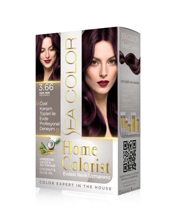 SEA COLOR HOME COLORIST Kutu İçeriği: 2 Tüp Krem Saç Boyası (50 ml) 1 Tüp Asistan Krem Saç Boyası (30 ml) 2 Oksidan Krem (2x65 ml) 1 Saç Bakım Kremi (10 ml) 1 Çift Eldiven Sea Color HomeColorist Serisi ile kullanıcının profesyonel kanallara ihtiyaç duymadan, daha yoğun beyaz kapamak, renk yoğunluğunu artırmak ve istenmeyen kızarıklık oluşumlarını engellemek gibi işlemleri kendi başına evde yapabilmesi hedeflenmiştir. Boya seti boya içinde esas renge destek olacak ve asistan boya olarak adlandırılan 30 ml tüp eklenmiştir. Asistan boya desteği ile Daha iyi beyaz kapama, Daha canlı renk sonuçları, Bazı renklerde oluşabilecek istenmeyen kızarıklıkları nötralize etmek amaçlanmıştır. 18 renk seçeneği sunar