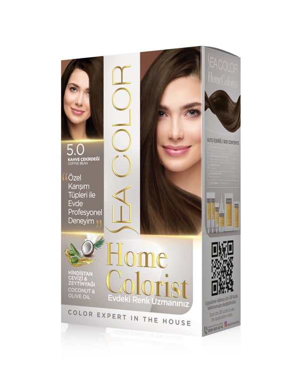 SEA COLOR HOME COLORIST Kutu İçeriği: 2 Tüp Krem Saç Boyası (50 ml) 1 Tüp Asistan Krem Saç Boyası (30 ml) 2 Oksidan Krem (2x65 ml) 1 Saç Bakım Kremi (10 ml) 1 Çift Eldiven Sea Color HomeColorist Serisi ile kullanıcının profesyonel kanallara ihtiyaç duymadan, daha yoğun beyaz kapamak, renk yoğunluğunu artırmak ve istenmeyen kızarıklık oluşumlarını engellemek gibi işlemleri kendi başına evde yapabilmesi hedeflenmiştir. Boya seti boya içinde esas renge destek olacak ve asistan boya olarak adlandırılan 30 ml tüp eklenmiştir. Asistan boya desteği ile Daha iyi beyaz kapama, Daha canlı renk sonuçları, Bazı renklerde oluşabilecek istenmeyen kızarıklıkları nötralize etmek amaçlanmıştır. 18 renk seçeneği sunar