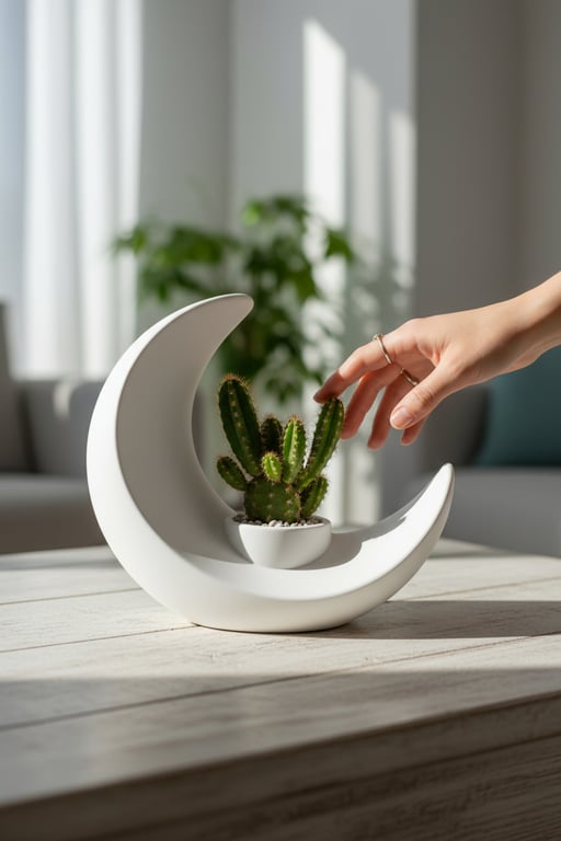 Hilal figürlü tasarımıyla öne çıkan bu dekoratif vazo, modern ve anlamlı görünümüyle yaşam alanlarına şık bir dokunuş katar. Masa, raf veya konsol üzerinde sergilemek için uygundur. Dekoratif kullanım ve hediye için idealdir.