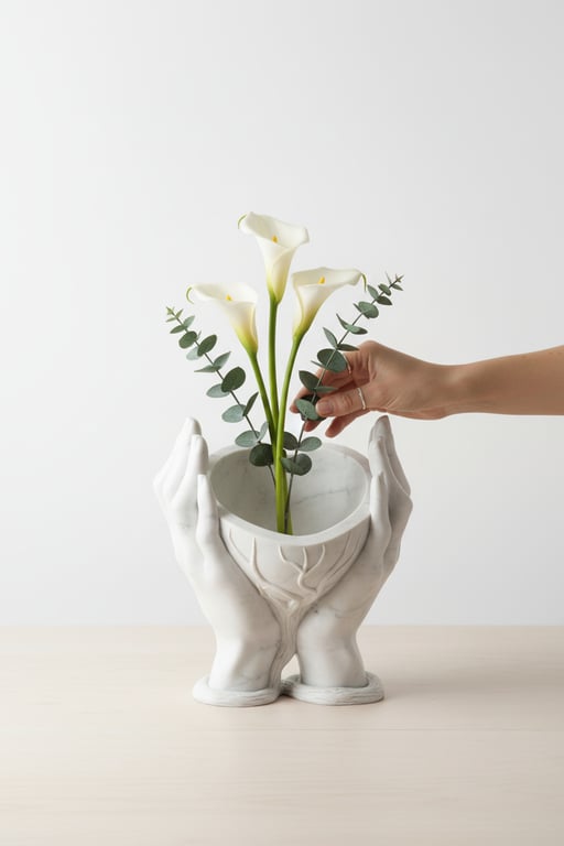 Kalp tutan el figürüyle tasarlanan bu dekoratif vazo, anlamlı ve modern görünümüyle yaşam alanlarına şık bir dokunuş katar. Masa, raf veya konsol üzerinde sergilemek için uygundur. Dekoratif kullanım ve hediye için idealdir.