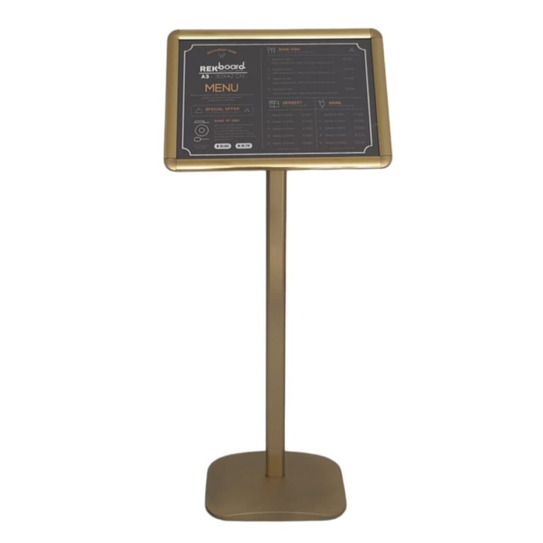 Ayaklı A3 Gold Menü Tabelası konuklarınıza lüks bir deneyim sunar. Aynı zamanda, demonte yapısı kolay taşınabilirlik sağlar.