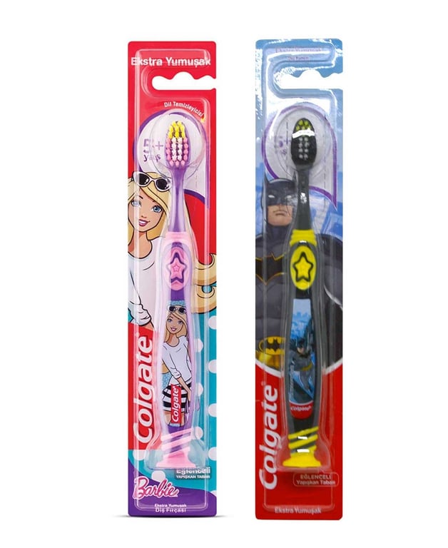 Çocuklara diş fırçalamayı sevdiren Colgate Barbie-Batman Çocuk Diş Fırçası eğlenceli tasarımı ve dik durmasını sağlayan yapışkanlı alt yüzeyiyle çocukların kolayca kullanabileceği biçimde tasarlandı.