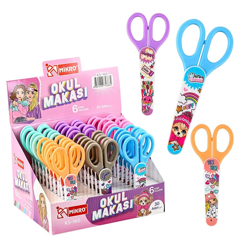 Mikro KS-160 Büyük Kablı Korumalı Okul Makası 6 Renk Tasarımlı Kızlar İçin 30 Adet'li 8681248753884