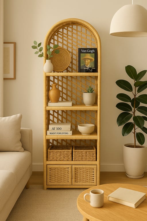 Evinize doğal bir şıklık katacak 5 raflı kapaklı hasır rattan dolap, hem dekoratif hem de işlevsel yapısıyla dikkat çeker