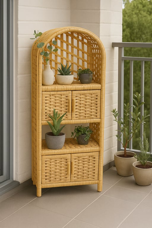 El işçiliği detaylarıyla öne çıkan bu hasır 4 kapaklı raf ünitesi, hem dekoratif hem de işlevsel tasarımıyla dikkat çeker