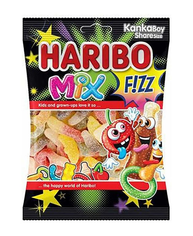 Haribo Mix Fizz Yumuşak Şekerleme farklı renge ve tada sahip küçük ve eğlenceli şekelerlemeler içerir. Yumuşacık ve çiğnenebilir formu ve içerdiği doğal aromalarla lezzetli ve eğlencelidir, hem çokcuklar hem de büyükler için keyifli bir atıştırmalıktır.
