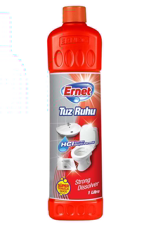 Kullanım Şekli; Ernet Süper Tuz Ruhu, lavabo ve tuvaletlerde güvenle kullanılır. Uygulayacağınız yere yeterli miktarda döküp, fırça ile ovunuz. Kirler çözülünce yüzeyi bol su ile durulayınız. Mutfak, banyo ve tuvaletlerde oluşan kireç birikimini, kararmış organik kir ve pas lekelerini çözer ve temizler.