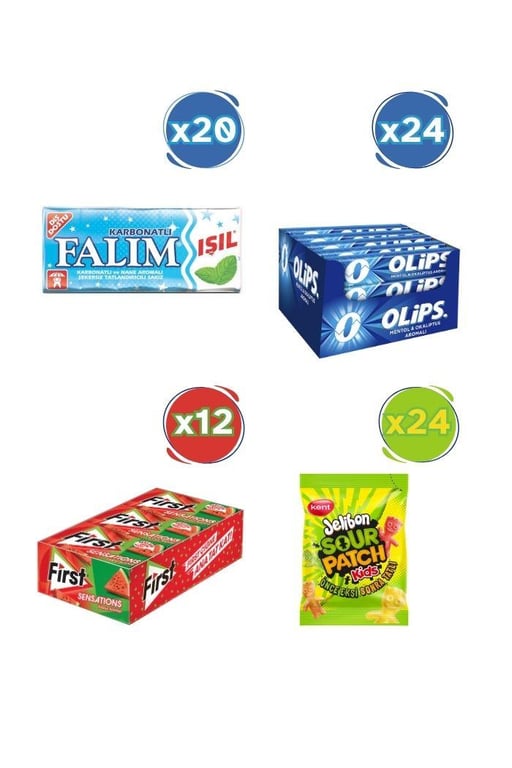 Falım Işıl Nane Aromalı Sakız (5'li x 20 Adet)- Olips Mentol Okaliptüs 24'lü Paket (28gr x 24 Adet)- First Sensations Karpuz Aromalı Sakız (27gr x 12 Adet)- Jelibon Sour Patch Kids (80gr x 24 Adet)
