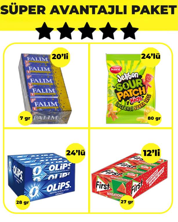 Falım Damla Aromalı Sakız (5'li x 20 Adet)- Olips Mentol Okaliptüs 24'lü Paket (28gr x 24 Adet)- First Sensations Karpuz Aromalı Sakız (27gr x 12 Adet)- Jelibon Sour Patch Kids (80gr x 24 Adet) Avantajlı Bakkal Paketi