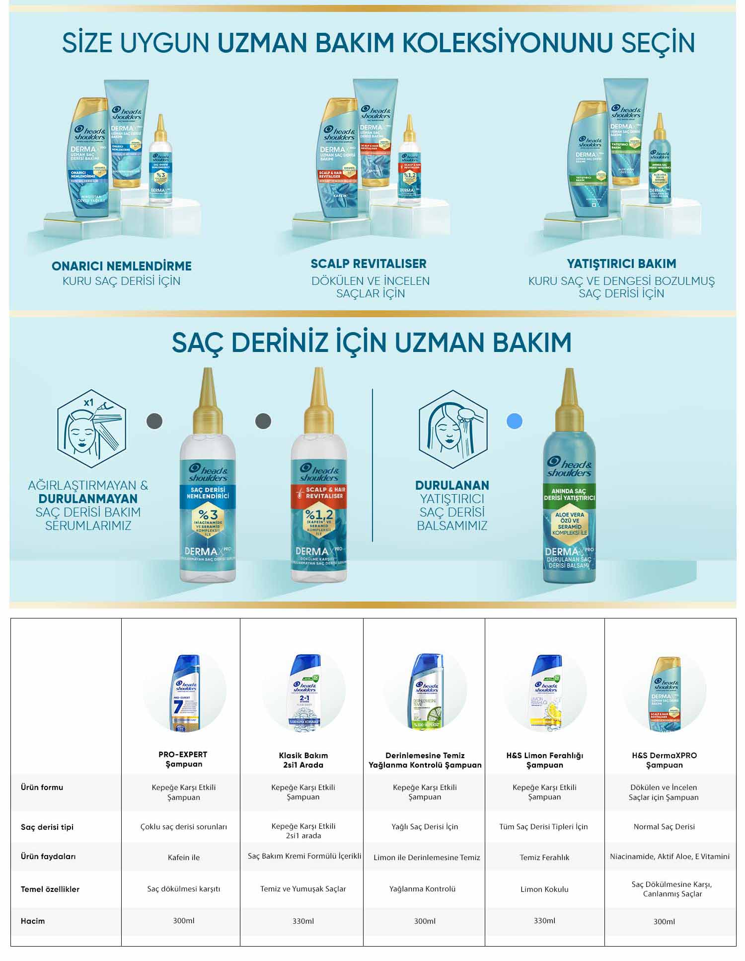 Head & Shoulders DermaXPro Hair Revitaliser Saç Kremi ile sağlıklı, beslenmiş ve kepeksiz* saçlara merhaba. Saç kremimiz her kullanımda saç tellerini kopmalara karşı güçlendirmeye yardımcı olur ve saç uçlarınızı ağırlaştırmadan besler. Kökten uca masaj yaparak yedirdiğinizde saç kremi düzenli kullanımda 4 haftada saç kalitesinde iyileşme sağlar. Kafein** ve seramid kompleksi (Pirokton Olamin + seramid) içeren bu ürün, kuru saç derisi ve güçsüz saçlar için özel olarak tasarlanmıştır. Head & Shoulders DermaXPro Revitaliser dökülme karşıtı Etkili Şampuan ile birlikte kullanıldığında dökülme karşıtı korumaya, kuruluğu ve pullanmayı önlemeye yardımcı olarak kökten uca kepeksiz* saçlarınızın güzelliğini ortaya çıkarır (*Düzenli kullanımla gözle görülen kepekleri önlemeye yardımcı olur, **Sentetik kafein).