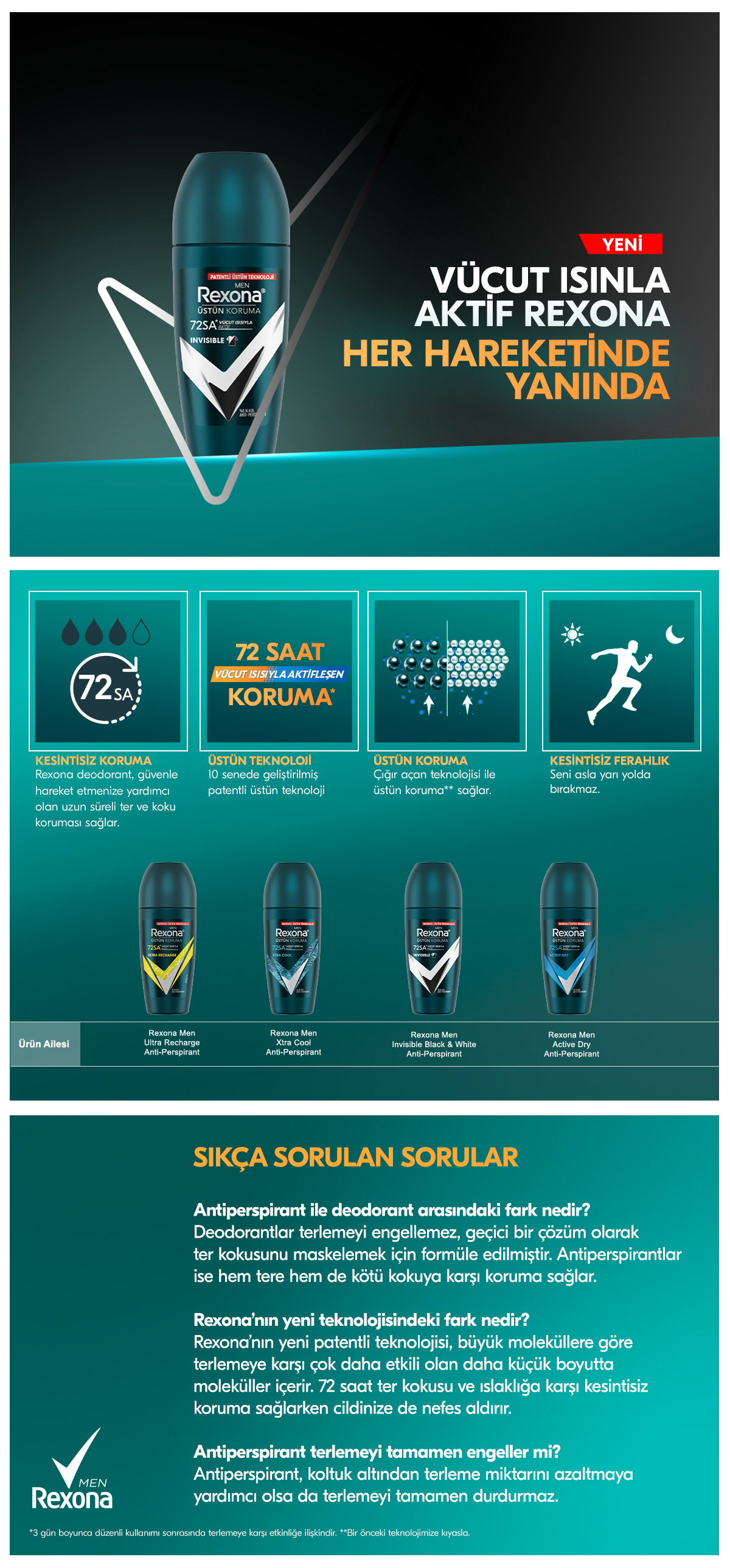 Rexona Men Xtra Cool Roll-on Deodorant, vücut ısısıyla aktifleşen özel teknolojisiyle ıslaklık ve ter kokusuna karşı 72 saat* boyunca etkili koruma sağlar. Gün içinde hareket ettikçe aktifleşen formülüyle, yoğun tempolu yaşamınıza uyum sağlayarak ferah kalmanıza yardımcı olur. Rexona Men Xtra Cool Roll-on Deodorant’ın kokusu, gün boyunca taze ve serin bir his sunar. Spor yaparken, iş yerinde ya da günlük rutinlerinizde güvenle kullanabileceğiniz bu deodorant, sizi rahatsız eden ıslaklık ve istenmeyen kokulara karşı güçlü bir bariyer oluşturur. Rexona Men Xtra Cool Roll-on Deodorant ferah kokusuyla erkeklerin tercihi olurken, hareket ettiğiniz her anda vücut ısısıyla aktifleşerek korumasını artırır. Günlük hayatın yoğunluğunda size destek olurken, ferahlık hissini her an yanınızda taşır. Yoğun çalışma temposuna ve fiziksel aktivitelere uygun yapısıyla Rexona Men Xtra Cool Roll-on Deodorant, gün boyunca tazelik ve koruma arayan erkekler için ideal bir seçimdir. Tüm cilt tipleri için uygundur ve günlük kullanıma idealdir. Rexona Men Xtra Cool Roll-on, özellikle sıcak yaz günlerinde veya yoğun egzersiz sonrası ferah kalmanız için tasarlanmıştır. Kullanım: Temiz ve kuru cilde uygulayın. Uyguladıktan sonra tamamen kurumasını bekleyin.