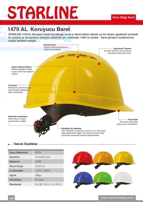 STARLINE 1470 AL Koruyucu baret dış kabuğu ya da iç takımı tahrip edecek ya da hasara uğratacak seviyede bir çarpma ya da darbenin enerjisini azaltmak için üretilmiştir. Hafif ve rahattır. Baret gövdesi havalandırma amaçlı deliklere sahiptir.