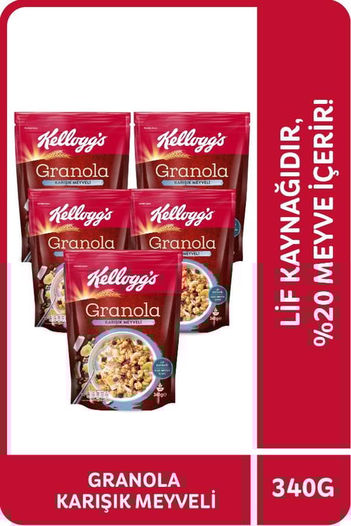 Kellogg's Granola Karışık Meyveli 340 Gr X 5 Adet, %45 Yulaf İçerir, Lif Kaynağı, %20 Kurutulmuş Meyve SET.KLN.18