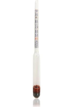 Sıvılardaki alkol oranını ölçmek için kullanılır. Camdan yapılan alkolmetrenin bir ucunda sıvı içinde dik durmasını sağlamak üzere ağırlık, diğer ucunda ise silindirik bir sap bulunmaktadır. İnce uzun bir kaba ölçülmek istenen sıvı konur, daha sonra bu kabın içerisine, serbestçe yüzecek şekilde alkolmetre yavaşça bırakılır. Sıvı yüzeyi ile temas eden ölçek hızanındaki değer yüzde (%) olarak sıvının hacimsel alkol oranını verir. Alkolmetre kullanımı için en pratik sıvı kabı 250 ml'lik mezürdür. Şarapta kullanıma uygun değildir, etil alkol içeren votka, rakı, cin gibi içeceklerin alkol miktarını ölçmek için kullanır. ürün adeti 1