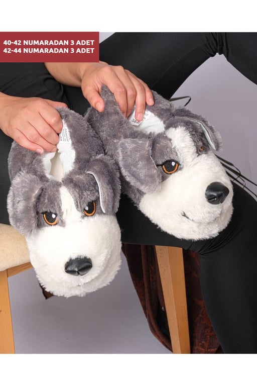 Unisex Gri Tüylü Köpek Figürlü Pofuduk Peluş Panduf Ev Terliği