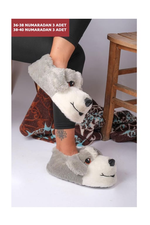 Unisex Gri Tüylü Köpek Figürlü Pofuduk Peluş Panduf Ev Terliği erepia9