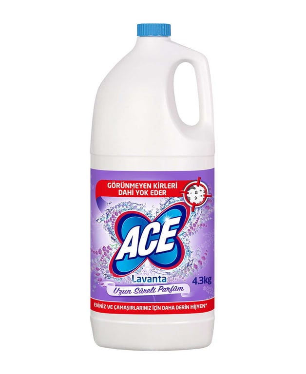 Ace Çamaşır Suyu hem ev temizliğinde hem çamaşır yıkamada derinlemesine hijyen sağlar. Ace Klasik Lavanta, leke çıkarmada etkili, hijyenik bir temizlik sağlar. Lavanta kokulu formülü ile çamaşır suyunun keskin kokusunu hafifletir. Ev temizliğinde ve beyaz çamaşırlarda kullanıma uygundur.
