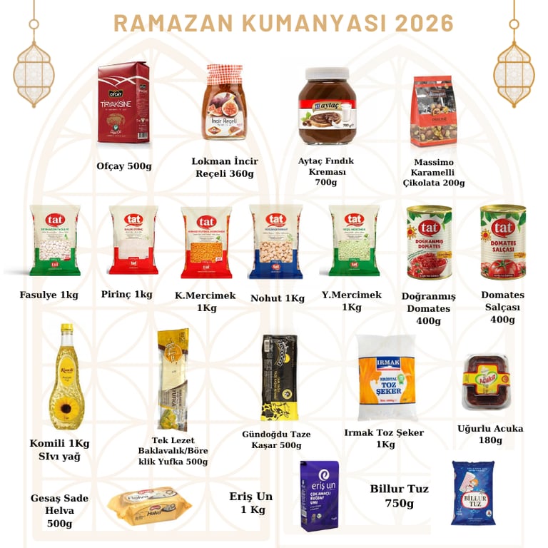 TAT KIRMIZI MERCİMEK 1KG ,TAT DERMASON FASULYE 1KG T,AT BALDO PİRİNÇ 1 KG ,TAT NOHUT 1KG, TAT YEŞİL MERCİMEK 1 KG, TAT DOMATES SALÇASI 400 G ,TAT DOĞRANMIŞ DOMATES 400G, GÜNDOĞDU TAZE KAŞAR 500G, UĞURLU ACUKA 180 G, MASSIMO PRALINE KARAMEL ÇİKOLALATA 200 G, TEK LEZET BAKLAVALIK/BÖREKLİK YUFKA 400 G ,ERİŞ UN 1 KG, OFÇAY TİRYAKİ 500 G, AYTAÇ KAKAOLU FINDIK KREMASI 700G, LOKMAN İNCİR REÇELİ 360 G, GESAŞ SADE HELVA 500G ,KOMİLİ SIVI YAĞ 1 L, IRMAK ŞEKER 1KG ,BİLLUR TUZ 750 G