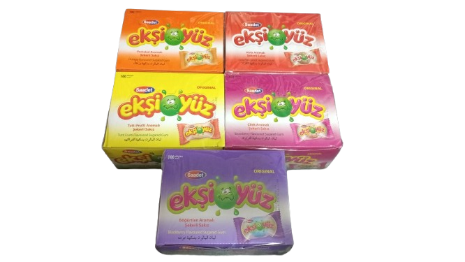 Ekşi Yüz Mix 100'lü Paket Sakız. Koli İçinde  Her bir Çeşitten 4 'er Paket Bulunmaktadır. Bunlar ;